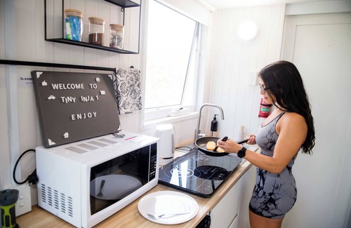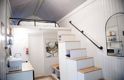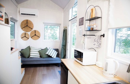 A cozy 190-square-foot tiny home with a queen-sized bed up in the loft and a couch, which can be converted into a single bed on the ground floor. It has easy access to water, split air conditioning, a kitchenette, cooking equipment, and excellent bathroom facilities.