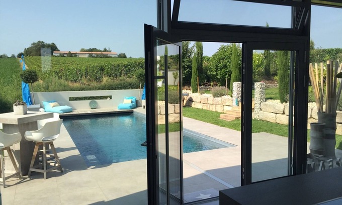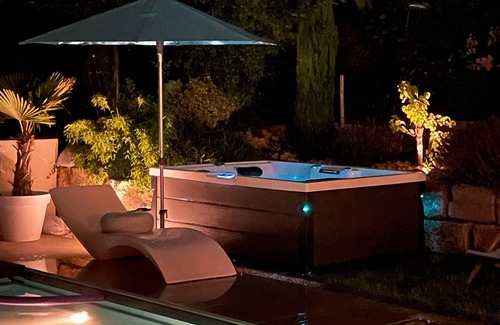 The villa is ideal for couples or families with max. a child. The house has a bedroom with dressing room, a sofa bed, a fully equipped design kitchen with dining area, a bathroom and an outdoor bathroom for the pool area. The outside staircase leads to the large roof terrace with a 360 degree view of the Rhine valley and the vineyards. The house has all amenities such as BBQ grill, pool heating, television, Nespresso machine, lounge furniture, etc.