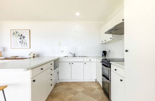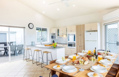 The kitchen features a load of bench space to prepare meals, induction cooking, dishwasher, and a family size fridge/ freezer - you can immediately imagine enjoying a glass of wine whilst you soak in the atmosphere as you cook and converse with your guests. The 10-person dining area is strategically placed in front of the large glass windows and doors that draw cooling breezes and water views.
