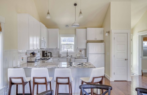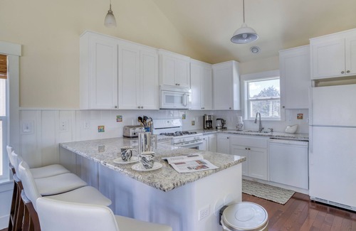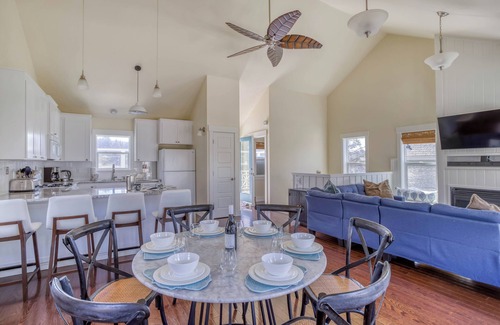 The top-floor, ocean-view great room has a vaulted ceiling framing the excellent gathering space. A contemporary sectional surrounds the TV and gas fireplace, a dining table for six (plus seating for four at a beautiful granite breakfast bar), and a beautiful gourmet kitchen with a gas range and a kitchen sink with park views will draw your guests together. The deck, suspended high in the air, affords great views and includes a barbecue to extend your dining options. The home’s bedrooms are on a lower level for privacy and quiet: a king suite and two queen bedrooms (one with terrific ocean views!) take up one floor, and a kids’ retreat has two twins with trundles and a spacious media area for games and TV. The ground floor has a foosball table in the garage and an entrance door for trips to the park.