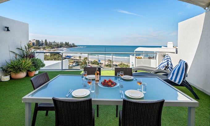 Enjoy all the coastal comforts at this top-floor unit featuring 2 bedrooms, 2 bathrooms & spectacular views. The master features a king bed/ensuite & bedroom 2 with two single beds & a separate bathroom with a spa bath offering ocean views. Enjoy your private rooftop terrace with a hot tub & stunning views of Kings Beach. This unit is within the beachfront Rolling Surf Resort, enjoy access to a 60m partially heated pool with a lap section, a large wading area perfect for kids, plus a small gym.
