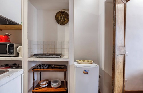 The apartment is on the first floor of a charming 18th-century building. It has been recently renovated, revealing original wooden ceilings and terracotta brick walls from the 1700s — a blend of history and modern comfort.