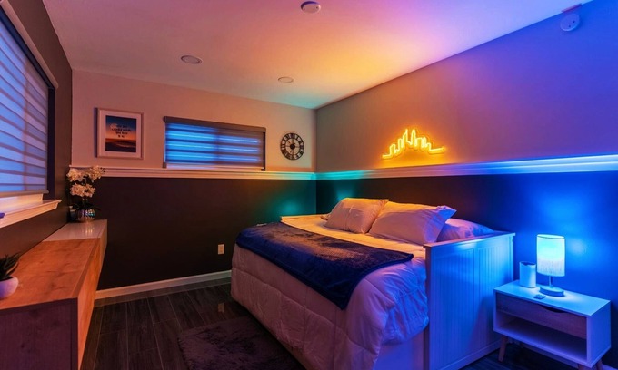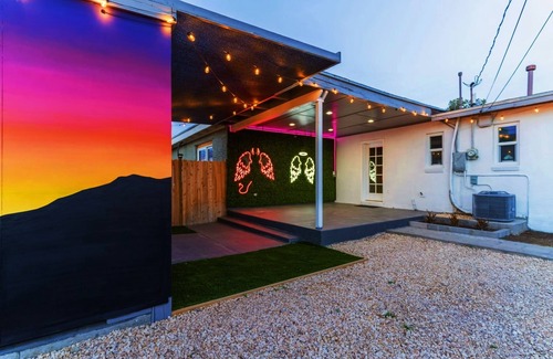 This unique place combines all the best that El Paso has to offer, the combination of cultures, art, amazing sunsets; and top-end amenities like a hot tub for 5 persons, a fire pit, neon lights, ambient rooms with led lights, and murals, to boost your getaway and your social media.