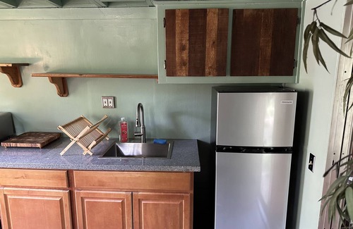 This one-of-a-kind cottage looks like it's out of a fairy tale. It is a lovely mix of antique and modern, nestled in the middle of gorgeous oak trees. The bedroom is tucked away in the upstairs loft, providing a treehouse-feel. Brand new marble bathtub below and kitchenette. The free-standing private cabin is nestled between 2 private creeks and mountain trails - it is a true respite from the city.