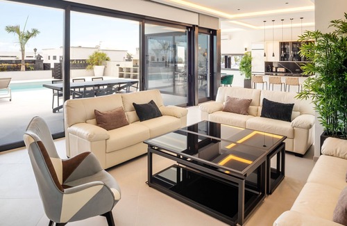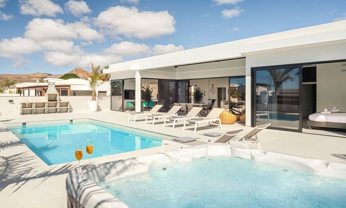 One of the villa's crowning features is its expansive outdoor area, where indulgence knows no bounds. Immerse yourself in pure bliss as you take a dip in the 10-meter-long heated pool, enveloped by the warm Lanzarote sunshine. For moments of relaxation, sink into the bubbling waters of the outdoor hot tub or unwind on plush loungers while savoring grilled delights from the BBQ area.