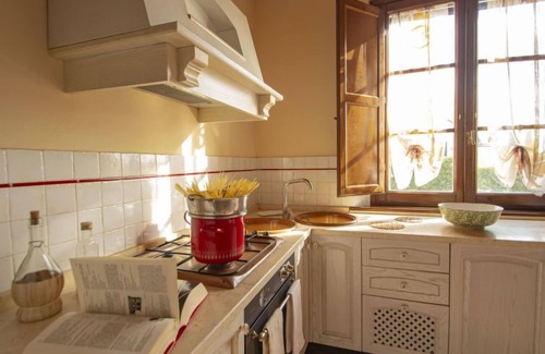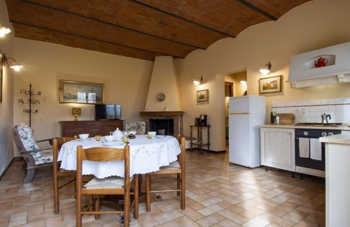 "Torraccia 2", 3-room apartment 75 m2, on the ground floor. Rustic and cosy furnishings: living/dining room with open-hearth fireplace, dining table and satellite TV. 1 double bedroom. 1 room with 2 beds. Open kitchen (oven, 4 gas rings, freezer, electric coffee machine). Shower/bidet/WC. Gas heating. Patio. Terrace furniture. Panoramic view of the countryside. Facilities: mosquito net, children's high chair, baby cot. Internet (WiFi, free). Please note: non-smokers only. 1 pet/ dog allowed. Private entrance.