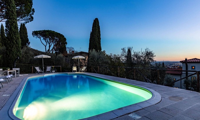 Torre Angelina is a structure, newly restored with elegant taste, set on the green hills of the Valdinievole. The hills surround the entire town of Montecatini Terme, bordered on the horizon by the plain that stretches towards Pisa and which ends on the towering outline of the old medieval borgo of Montecatini Alta with its alleys and castles, sentinel from on top its dominant position with wonderful panoramic views. This is the viewpoint, unique at dark when illuminated by the lights of the town, seen from the delightful swimming pool and the garden that surrounds this particular, stylishly-refined residence. The villa is characterised by the charm of Tuscan architectural tradition combined with the new technologies of green design, such as walls insulated with hemp and ceilings with exposed beams and terracotta tiles. The structure is enriched with elegant details, with walls frescoed in an eclectic style and characterised by unique and original rooms. It is also equipped with solar panels and super efficient systems providing you with rare comfort. The property has three floors; on the ground floor is a bright, cosy kitchen next to the dining room with a guest bathroom. On the same floor are two bedrooms with ensuite bathroom and in the tower, on the ground floor, is a living area with Smart TV and fireplace. On the top floor, besides a small sitting room with sofa bed, are the other bedrooms with tasteful design and panoramic view. The property is less than 3 km from the spas that have brought international fame and prestige to Montecatini Terme which, with its vital force flowing from the ground, its Art Nouveau-style buildings, tree-lined avenues and large parks, is the most precious gem in the centre of an artistic and panoramic area of exceptional quality; it is the perfect starting point, thanks also to its proximity to the A11 motorway (less than ten minutes away), for visiting the main cities of Tuscany, such as Florence, Pistoia, Lucca and Pisa, as well as the beautiful sea of the Versilian coast, just half an hour away. Furthermore, for sports enthusiasts there are riding clubs, tennis clubs and a prestigious 18-hole golf course in the amazing setting of Monsummano Terme in the immediate vicinity of the property. Near the property is the departure station for transport of unique charm, L'ANTICA FUNICOLARE (funicular railway) dated 1898, which will take you in just a few minutes to Montecatini Alto, a medieval borgo with beautiful little streets full of small shops and typical restaurants where you can spend relaxing evenings. N.B. The property borders (on one side) the owners' villa, from which it is separated by a hedge screen to guarantee privacy.