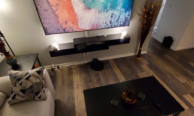 A decorative living room with customized lighting, housing a huge Smart TV, and a variety of games.