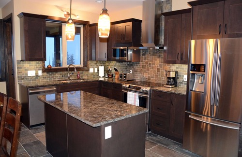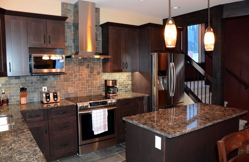 A richly appointed kitchen with all the appliances & items you will need to cook delicious meals at "home". The kitchen has slate floors, granite counter tops, ample cupboard space, stainless appliances and a center island. Enjoy meals around the large solid wood dining room table with seating for 8 (plus two) comfortably. After a day on the slopes relax around the stone fireplace in the living room, playing a board game or watching the large "Smart TV". There is a powder room bathroom on this level for your convenience. A huge deck, complete with a BBQ, is situated off the main floor.