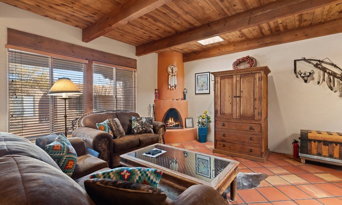 Step into a welcoming living room adorned with the timeless appeal of Santa Fe. The space boasts a kiva fireplace, providing a cozy ambiance for gathering with loved ones. Wooden rafters and tile floors add to the authentic charm, creating a comfortable retreat after a day of exploring the vibrant city.