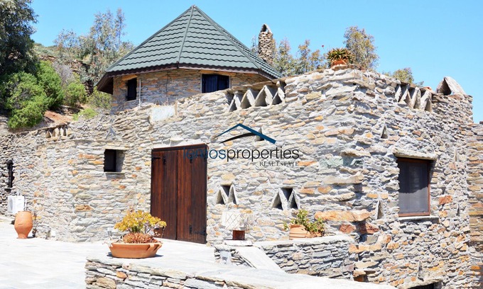 Τhe villa is on two levels and is set on a 2,000sq meters plot of land over looking the Bay of Koundouros. The main house, which is part of an old wind mill consists of a living room with a fireplace, a large dining area. a fully equipped kitchen with a breakfast area. On the top floor of the wind mill is the master bedroom with an en-suite bathroom. Leading off the dining room there are stairs to the ground floor, where there is a small seating area with a fireplace and a built-in sofa bed. On this level there is also a bedroom with a double bed and an en-suite bathroom, second bedroom with two built-in single beds with a fireplace and an en-suite bathroom.