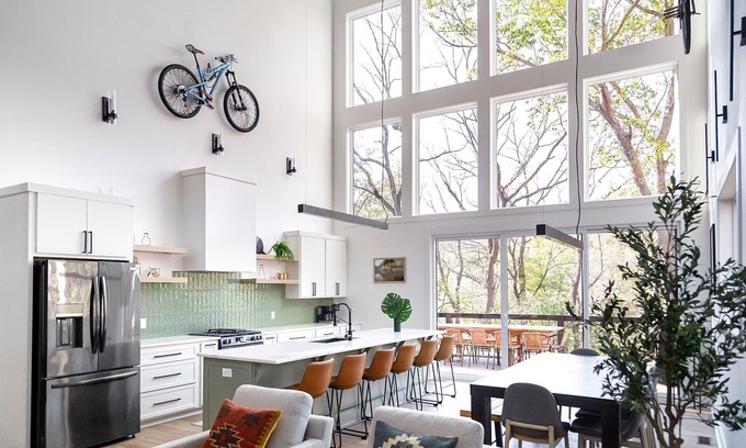 The Trail Town Villa is one of Northwest Arkansas’ newest and most iconic luxury vacation rentals. Designed specifically for mountain bikers by mountain bikers, no detail has been overlooked. From the 500 sqft. fully-equipped indoor bike garage to the hot tub and five distinct outdoor living spaces, the Trail Town Villa offers the ultimate NWA mountain bike experience inside and out.