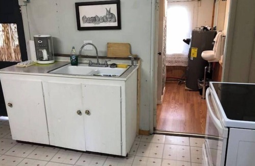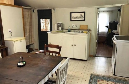 The whole cabin and lot is yours complete with a small kitchen and bathroom with shower. Two small bedrooms. A sun porch looking out towards the field. There’s a fire pit and picnic table.