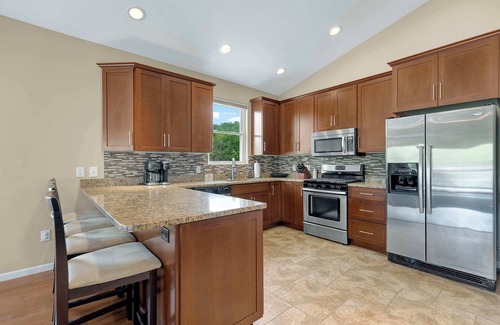 Inside the home, vaulted ceilings on the main level highlight the open floorplan, conducive for both connection and relaxation as you connect with loved ones during your well-earned downtime. Sink into plush sofa and recliner seating in the living room as you stream all your favorite shows on the mounted smart TV, the fireplace providing an ideal ambiance for a cozy movie night. Steps away, the stylish kitchen showcases stainless steel appliances, glossy stone counters, and rich dark cabinetry stocked with all the comforts of home. When you’re not dining outdoors, snag a high-top stool at the counter for quick and casual bites or take a seat at the dining table, seating 4 for formal meals and game nights alike.