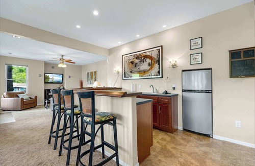 Speaking of games, it’s all fun and excitement on the lower level, a secondary living space sure to liven up the party as the mixologist among you shakes and stirs up new creations at the wet bar and you stream the big game on the TV. Enjoy a game at the pool table or try your hand at shuffleboard, both offering hours of friendly competition.