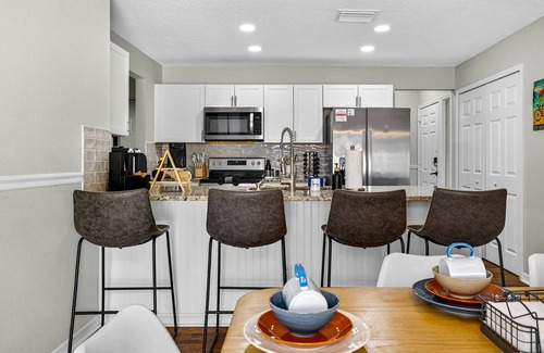 In the private backyard, you will find a heated pool, hammock, and covered dining area with grill (propane included) and mini refrigerator. You won’t have to go far to grab cold beverages or ice cream from the patio!