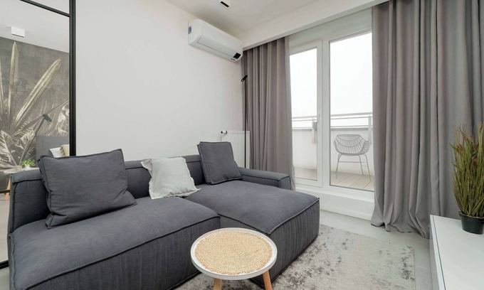 This luxury apartment is located on the ninth floor and is designed for two people. The unit has one bedroom, where a large and comfortable double bed stands, as well as a capacious closet ideal for storing brought clothes or handy trinkets. The air-conditioned living room has a comfortable gray corner sofa, as well as a small table. In the evenings you can sit here to relax with your favorite television programs. A dining table with chairs and a functionally equipped kitchenette are also available in the room. Meals can be prepared with appliances such as a coffee machine, microwave, oven and induction hob. Both the living room and bedroom have access to a spacious, furnished balcony. This is the perfect place to enjoy your morning coffee with a view of the neighborhood. In the bathroom, a welcome towel set, hair dryer, washing machine and bathtub await guests, where they can relax in the evening after a day's activities. Carefully selected decorations and subdued interior colors make the apartment stylish and elegant, yet comfortable to use. Shades of white and gray dominate here. Wooden accents and a brick motif take care of adding variety to the arrangement.
