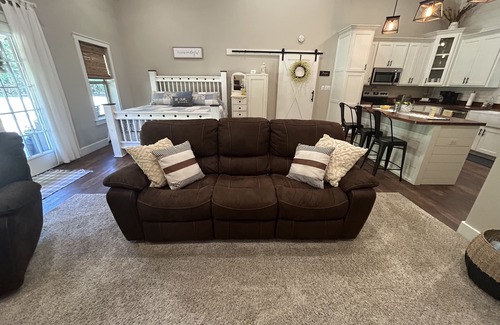 Surrounded by beautiful oak trees, our Oak Retreat Guest House is the perfect place to enjoy the tranquility of the country! Just 15 minutes north of Bonham, and nestled between Lake Bonham and the newly constructed Bois D’ Arc Lake, you are only minutes from shopping, dining and recreation. Built in 2021, the space is a 750 sq ft farmhouse style studio perfect for couples, or a couple with a small child. Beautiful wood vaulted ceilings and antique furnishings take you back in time.