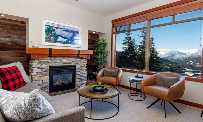 This unit is built, decorated, furnished and equipped to a far higher standard than you will find in most of Whistler's rental properties. The open concept living, dining and kitchen boasts large windows and stunning views. There is a covered west facing deck where you can barbecue dinner, lounge and enjoy evening sunsets. At the end of the day cozy up by the gas fireplace with a pillow and blanket, read a book, play a board game (provided) or watch a movie on the 55" The Frame TV by Samsung (includes Shaw cable, Netflix and Disney Plus). The home has high-end furnishings with leather lounge chairs and a luxurious sofa by American Leather that converts into a King size bed. There are cozy heated wool carpet and slate tile floors throughout the unit.