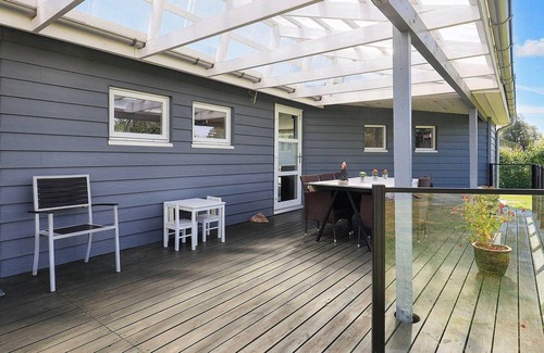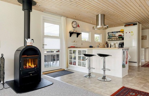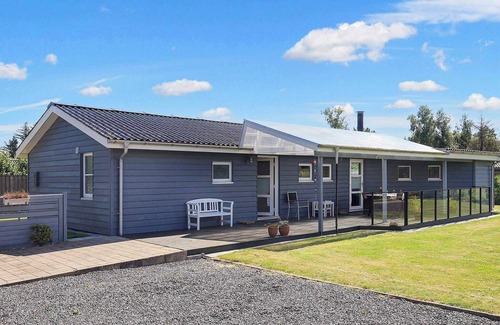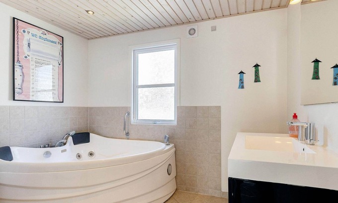 Spacious cottage with whirlpool located on a well-kept, grassy plot at Hou. Here there is a large wooden terrace and a pavilion, which acts as a covered terrace. The cottage has both a large bathroom with whirlpool and an additional guest toilet, both with underfloor heating. There is both a wood stove and a heat pump, so plenty of options for heating on slightly cooler evenings.