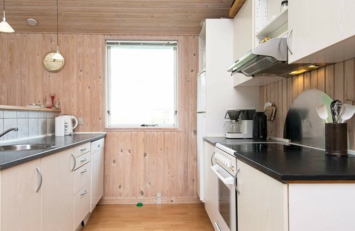 Layout: open kitchen(cooker(electric), hood, coffee machine, microwave, dishwasher, fridge-freezer, washing machine), Living/bed room(TV(satellite, german television channels, danish TV channels (DR1 and TV2)), DVD player, radio, CD player, stereo unit, high chair), bedroom(double bed, children's bed), bedroom(double bed), bedroom(double bed), bathroom(floor heating)(bathtub or shower, washbasin, toilet), Bubble bath(indoor, heated, 2 persons), heating(electric), terrace, BBQ, play equipment