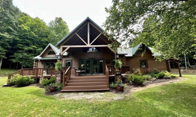 Welcome to Rocky Ridge Lodge. Our beautiful log cabin is perfect for a family/friends get away, reunions or anyone looking for a tranquil and relaxing stay in God’s country. We are within 30 minutes of Charleston WV, nestled on over 172 acres with amazing views, rock formations, hiking trails and fishing pond. On the front of the lodge there is a large, covered porch overlooking the pond, this is perfect for your morning coffee outside watching the beautiful wildlife. On the backside of the house the deck is perfect for large family dinners, equipped with an outdoor kitchen. The back deck includes multiple seating areas, swings, and rocking chairs overlooking the firepit and gorgeous scenic views.