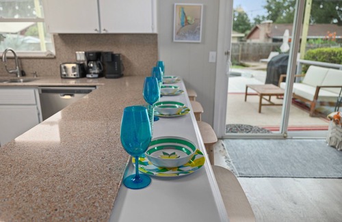 • An open kitchen and dining area with bar seating, fully equipped with a blender, Keurig and regular coffee makers, and a toaster.