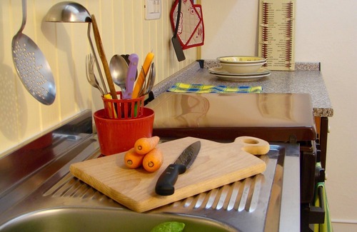 The apartment was newly renovated, every year we add something new to make our space cosier. It consist of a bedroom, a kitchen, a small living room, a bathroom and a big veranda with colorful flowers.