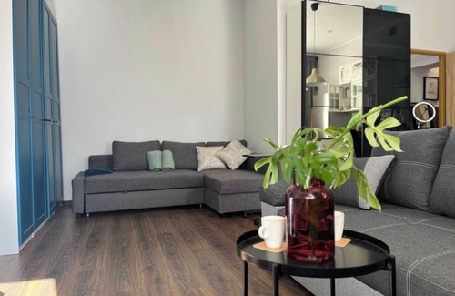 Welcome to our comfortable and fully equipped apartment, perfect for a short getaway or a longer stay. The living room offers everything you need for relaxation. A double sofa bed is the centerpiece. A coffee table and chest of drawers complete the space. The bedroom guarantees a good night's sleep thanks to its comfortable double bed. Guests have access to a spacious wardrobe, a bedside table, and a set of fresh linens. A functional desk with a chair is the perfect place for remote work. The kitchenette is equipped with all the necessary appliances for self-catering. You'll find a stove, oven, and a large refrigerator with a freezer. The bathroom features a modern shower, toilet, sink with mirror, and a practical cosmetics cabinet. A washer-dryer is extremely convenient. The apartment is pet-friendly and comes equipped with two beds, bowls, toys, a leash, and other accessories. Guests also have access to a shared balcony.