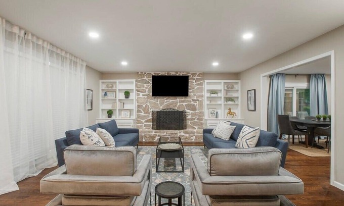 This spacious 2,500 sq. ft. home is perfect for your next visit to Tulsa/Jenks. Featuring two outdoor patios, one overlooking the creek, and backing up to another 2,500 sq. ft. home, it's ideal for hosting reunions or golf weekends just blocks from Southern Hills. Each bedroom is generously sized with a TV for relaxation after a day of exploring. Contact us for local recommendations on dining, shopping, and R&R during your T-Town getaway!