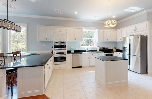 -The Home comes with fully equipped kitchen with electric stove/oven, combination microwave/convection oven, and full electric standalone convection oven, dishwasher, refrigerator with icemaker/water dispenser. There are 2 types of coffee makers, 2 toasters, a blender. We also provide dishes, utensils, cups, bowls, pots and pans, toiletries, condiments, etc. Extra toiletries can be found under the sinks in any bathroom or in the kitchen