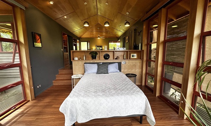 Welcome to the Tree Top Suite, your enchanting escape nestled in the greenbelt of Princeville, Kauai. This secluded rental offers a unique fusion of tropical tranquility and modern comfort. Floor-to-ceiling windows bathe the space in natural light, giving views of the surrounding nature. Decor consisting of live plants further blurs the lines between indoor luxury and outdoor splendor. The Tree Top suite is in a great location with a beautiful ten-minute walk down to the shores of Hanalei Bay.