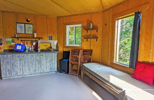 The treehouses are well equipped so you don’t have to bring much. YOU WILL TRANSPORT YOUR OWN BAGGAGE ON A HIKING TRAIL, A DISTANCE OF 200-1000 METERS (12-20 minutes). We provide 2 carts per treehouse. Each treehouse has access to 1 small cart and 1 large cart in summer OR 2 large toboggans in winter. Backpacks make transport easier. Wear appropriate footwear. Canoes are available for rent, and can be used for transport of baggage (Lakeside East only), 8 minutes paddling.