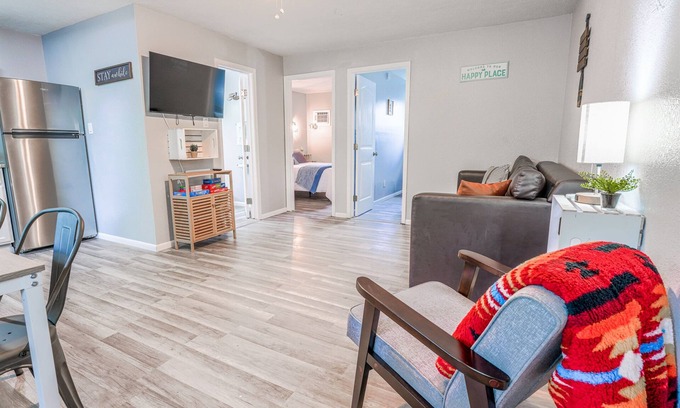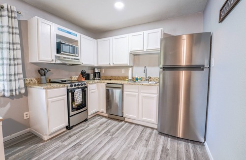 Step inside and enjoy your super cute and newly renovated condo! Tribesman #15 is one of our 2-bedroom / 1-bathroom condos. For previous guests, this was "Timber Ridge 2". Unit #15 is in on the end of a single level (no stairs!) building that has 4 similar units. There are a few steps to get up from the parking area. Also, patios and common spaces are near other units, which means you will likely spend outdoor time around other guests and families. At Unit #15, you'll be close to the swimming pool.