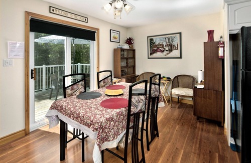 Fly your kite or fish off a private island, or play bocce ball. Well appointed accommodation suitable for a family of up to 6 people, 3 Bedrooms can comfortably sleep up to 6! Modern full sized kitchen with stove, oven, fridge, pots, pans, plates, dishes, glasses, cutlery, bowls, etc microwave, coffeemaker, kettle and toaster. Dining room suite seats 4, with added eating area island. 4 pc. bath with standard 5 ft. Jacuzzi whirlpool tub. Lower level 2 pc bath conveniently located. Bed Linens and bath towels provided. Large deck overlooking the ponds and Lake Eugenia, enjoy BBQ grilling and eating outdoors up in the trees. Immaculately clean, nonsmoking and no pets premises. Bring your bikes, and outdoor games. Ontario Trails and Bruce Trail nearby for some great hiking adventures! Grey Highlands licence # STA-2021-30-H.