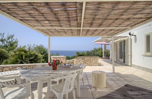 The villa enjoys a privileged position because being on a slight promontory (it is higher than the coast road that leads from Leuca to the beaches of Pescoluse) it offers a unique and panoramic view over almost the entire Bay of San Gregorio and also allows you to move easily. from one side to the other. About 150 meters from the house there is also a small path, with stone steps, which leads directly to one of the two beautiful bays made of pebbles.