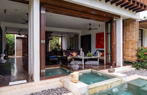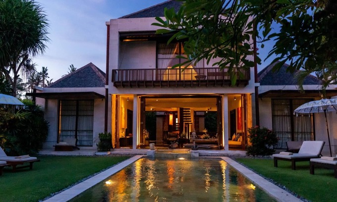 Located on the Southeast coast of Bali, the villa, the twin villa of Villa Raj, is a double-story pool villa of contemporary design mixed with traditional Javanese architecture. Exuding tropical comfort, the villa showcases a sweeping courtyard with lush lawn and greenery aplenty, an outdoor swimming pool, a bale and has own private access to the beach lounge area. Indoor living spaces are evocative chic, mixing hardwood timber panels with elegant furnishings. Selected art pieces large and small feature on walls and elevated surfaces.
