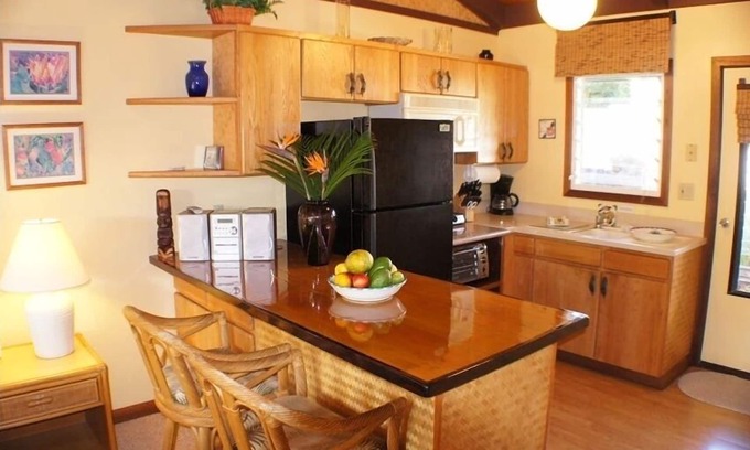 Cute Hawaiian art themed one-story studio just 300 feet from the ocean in a quiet off-the-beaten path in an ideal location in Poipu Beach. The Cottage has a kitchenette, A/C, high speed wifi, & convenient patio parking right in front. You can walk to Kukuiula Shopping center, nearby beaches, sea turtles, kayaking, & an assortment of restaurants nearby.