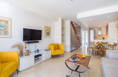This great apartment is divided into three levels. The ground floor has a bedroom with 2 single beds, a bedroom with one double bed and a bathroom with a shower. The main floor has a living room, kitchen with dishwasher, private terrace with direct access to the communal pool and outside dining area and a bedroom with 1 single bed. On the upper floor there is a bedroom with a double bed, a bathroom with an integrated shower and a private terrace.
