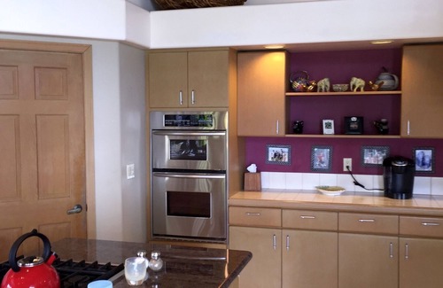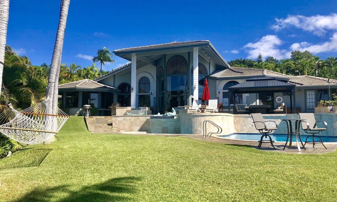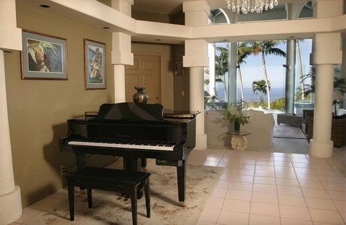 Hale Wailele (Waterfall House) is a beautiful, spacious home with floor to ceiling windows in the great room looking out onto fountains in the pool with an incredible ocean view beyond the palm trees and torches. The architecture of the home makes it unique and inviting with artistic touches such as arches and cathedral ceilings throughout. Our home is in a quiet neighborhood where most people live with open windows. Therefore, we do not offer it for weddings, meetings, or parties. The use and enjoyment of the house, pool, etc. is limited to the individuals listed on the rental agreement. We will only confirm reservations that give details about the group, purpose of the trip, and reassurances about being respectful and keeping noise at normal conversation levels. Disruptive behavior and excessive noise are not permitted.