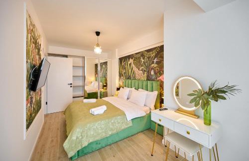 A few steps from Mamaia Beach in Mamaia Sat/Năvodari, Tropicana - Infinity Pool & Spa Resort provides accommodations with access to a hot tub, spa facilities, and fitness room. This beachfront property offers access to a balcony, free private parking, and free Wifi. The apartment features a rooftop pool with a pool bar, as well as a sauna and an elevator. Featuring a terrace and sea views, the apartment includes 1 bedroom, a living room, cable flat-screen TV, an equipped kitchen, and 1 bathroom with a hot tub and a shower. Towels and bed linen are offered in the apartment. The property has an outdoor dining area. Guests are welcome to eat at the on-site family-friendly restaurant, which is open for dinner and lunch. For guests with children, the apartment offers kids pool and an indoor play area. Siutghiol Lake is 5 miles from Tropicana - Infinity Pool & Spa Resort, while City Park Mall is 8.5 miles from the property. Mihail Kogălniceanu International Airport is 12 miles away.