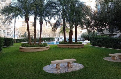 Espectacular apartamento de un dormitorio la Playa de Gandia amueblado con mucho gusto y clase, con aire acondicionado y calefacción tanto en el salón como en el dormitorio, situado en 3ª planta, con 2 camas en el dormitorio, amplio salón con sofá cama muy cómodo, y una gran terraza redonda con vistas al jardín, piscinas y zonas deportivas. Apartamento fresco de orientación Norte, así también la terraza acristalada. Cuenta con un baño con bañera. Práctica cocina con vitro cerámica. El edificio cuenta con piscina comunitaria tanto para niños como para adultos, zonas comunes ajardinadas y dos pistas de tenis. Está situado a 250 metros de la arena, cerca de Supermercados, restaurantes, del puerto, y muy cerca del conocido Paseo Rosa de los vientos. Capacidad 2/3 personas.