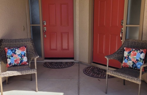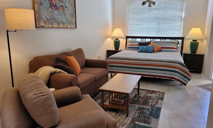 The B Studio Unit of Tropicana is in a 55 plus community of Green Valley Arizona. This studio offers a king bed, full bathroom, kitchenette, and sitting area. The community of San Ignacio Villas features a community pool and hot tub for residents and tenants use. The kitchenette has a microwave, toaster oven, coffee maker, mini refrigerator and sink. Television and internet are provided. This is a perfect spot to call home while you are visiting friends, family or just exploring the Green Valley area.