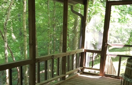 One of the best features of this cabin is that is has a screened-in back porch with a ceiling fan, and a deck that overlooks a creek within several wooded acres, and a separate deck that has 4 bar stools behind a piece of walnut live edge that face the creek and wooded acreage! You will find a nice sense of peace and solitude right here! Cozy up on the patio furniture on the back porch and enjoy the peace and quiet! Right off the screened-in porch, there is a charcoal grill for your use. There may be charcoal and lighter fluid left from a previous guest, but it would be a good idea to bring your own. There is also a fire pit to use for those nice evenings when you want to be outdoors. There is plenty of firewood for you to use during your stay.