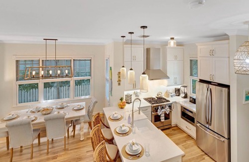 TRUMAN’S TROVE has an open and airy layout. The spacious living room features a large flat-screen TV and comfortable seating options. The plush sofa pulls out to a Queen sleeper to accommodate extra guests. The indoor dining area has a large dining table with seating for six and there is an additional three seats at the kitchen bar. The fully equipped kitchen has top-of-the-line stainless steel appliances and all the tools you'll need to prepare meals at home. There’s also a wine chiller next to the kitchen bar. A convenient powder room is located on the first floor.