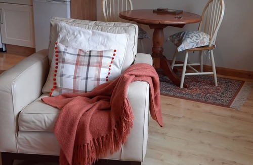From the lounge a pretty spindled staircase leads to the upper floor landing with a pine chest of drawers and an eclectic book collection. The double bedroom, with sloping ceiling has a comfortable, double bed and bathroom also with sloping ceiling, has a wash hand basin, WC and bath with hand-held shower over. All linen and towels are provided.
