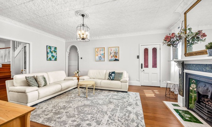 The bedrooms are well-appointed, with two rooms featuring queen beds, two rooms with double beds, and one room with a king single bed. The house is tastefully decorated, combining historical charm with modern touches to create a welcoming and comfortable environment for guests.