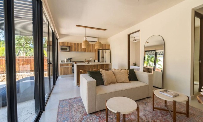 Peaceful and Serene the perfect spot for your family or group holiday. 3 bedrooms 2 bathrooms this lovely villa sleeps 6. King Bed and 2 Queen Beds. 1 bedroom on first level. Private pool as well as community pool with gym and playground. Lovely fenced backyard with outdoor dining and string lights perfect for a night swim. Paved roads! Minutes from Beach gated / 24 hr security. High speed starlink internet and free access to Tulum beach at Delek Hotel. Great for a family vacation!