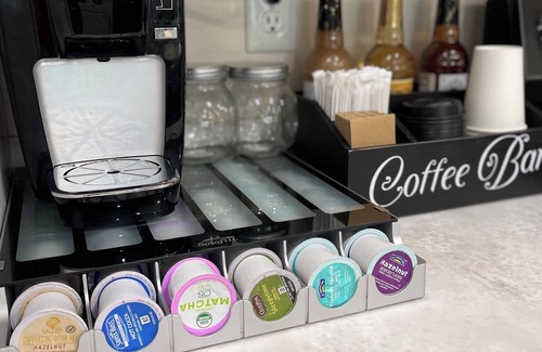 The kitchen is fully stocked with all the cookware, flatware, dishes, utensils, and a coffee bar you’ll need. The oversized granite kitchen island seats six, making it perfect for family meals or game nights.