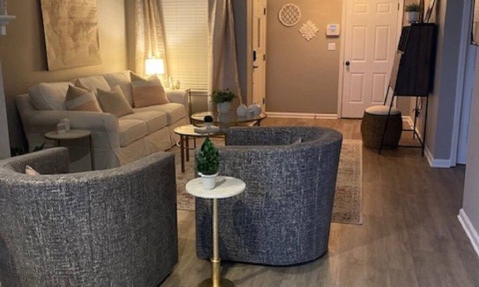 Kick back and relax in this quaint, stylish home. Newly renovated and comfortable open floor plan with flat.screen TV and dedicated work station. Fully stocked kitchen with double oven, microwave, air fryer toaster combo and full coffee bar. Four seat kitchen table plus three barstools seats seven total. Two bedrooms with king and queen beds and large flat screen TVs. Sofa also makes queen bed. Two full bathrooms. Nice peaceful patio with gas grill. Located in west Tupelo in a very quiet neighborhood.